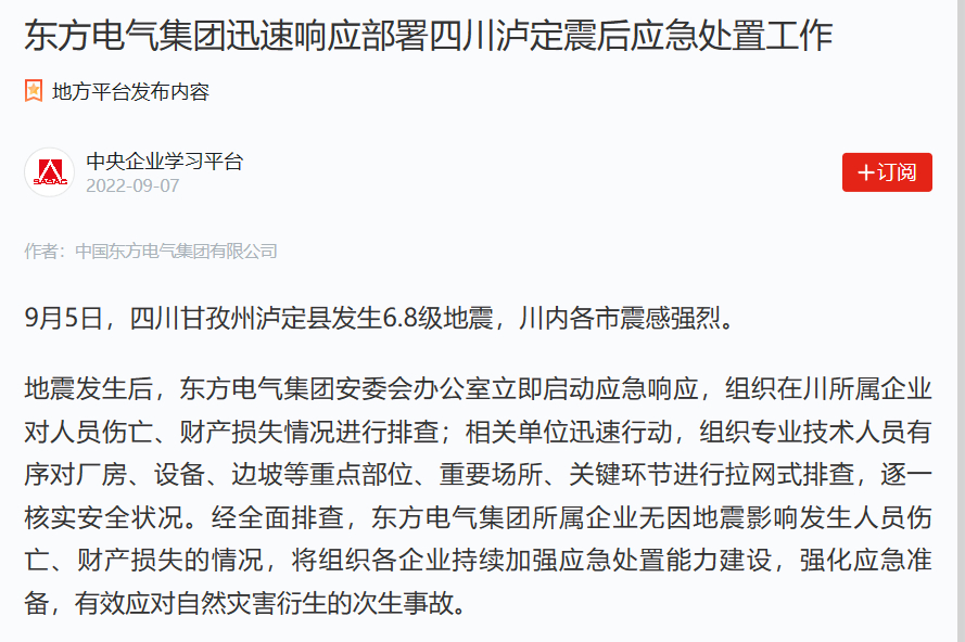 [学习强国]东方电气集团迅速响应部署四川泸定震后应急处置工作