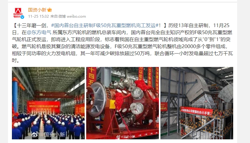 [国资小新]十三年磨一剑,#国内首台自主研制F级50兆瓦重型燃机完工发运#!