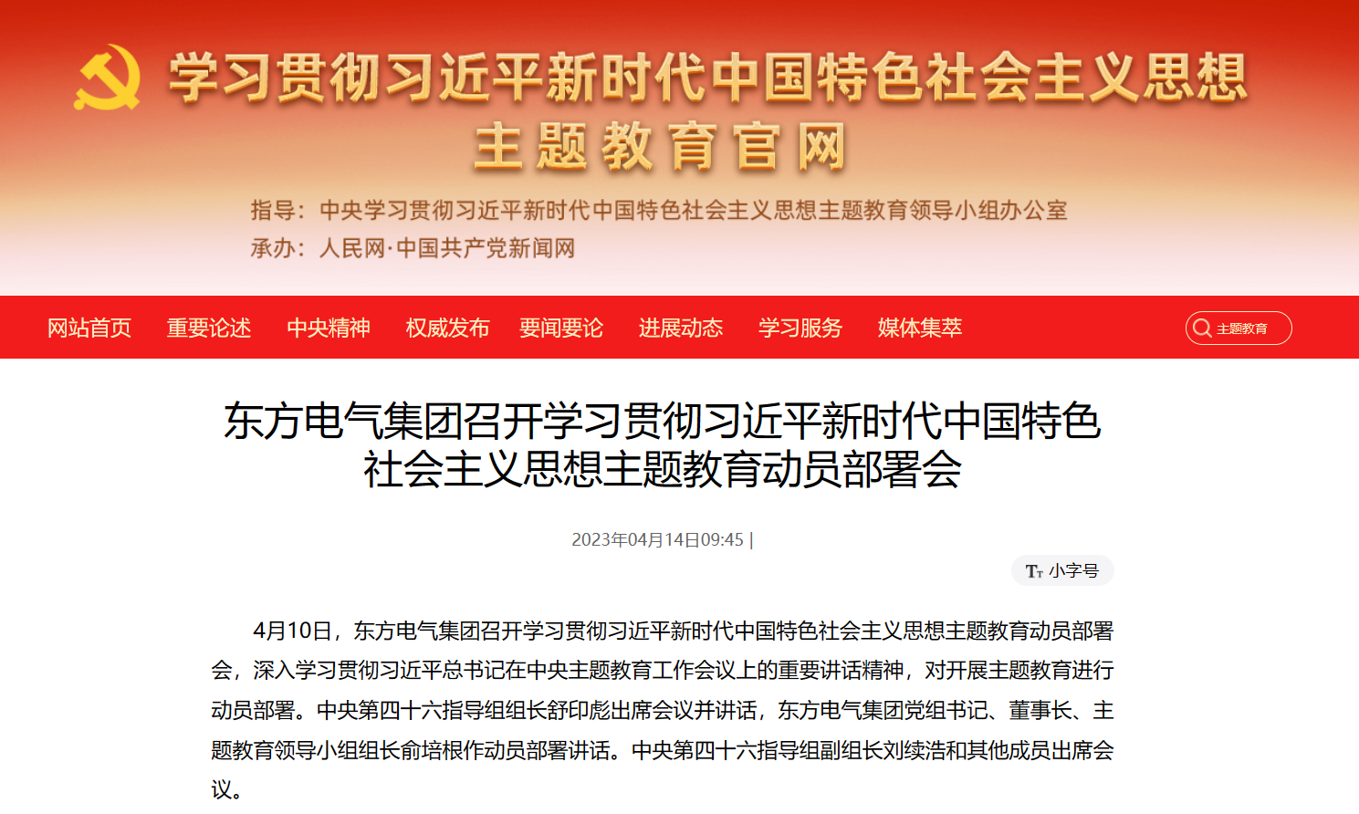 4月10日,东方电气集团召开学习贯彻习近平新时代中国特色社会主义思想主题教育动员部署会,深入学习贯彻习近平总书记在中央主题教育工作会议上的重要讲话精神,对开展主题教育进行动员部署。中央第四十六指导组组长舒印彪出席会议并讲话,东方电气集团党组书记、董事长、主题教育领导小组组长俞培根作动员部署讲话。中央第四十六指导组副组长刘续浩和其他成员出席会议。