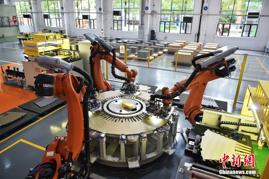 除了大型清洁能源装备重型制造数字化车间,东方电机还有另一个“明星车间”——全球首个定子冲片绿色“无人车间”。图为“无人车间”里的机器人在进行叠片作业。