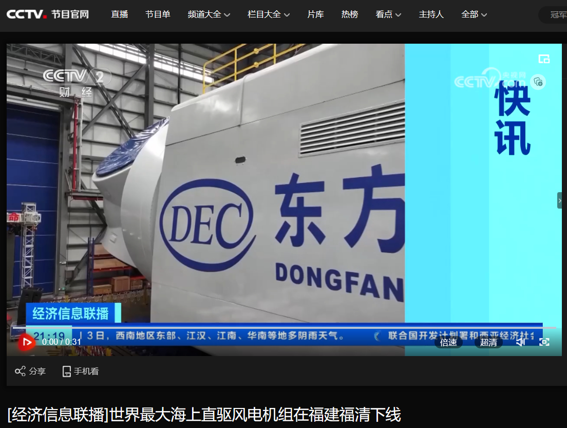 [央视经济信息联播]世界最大海上直驱风电机组在福建福清下线