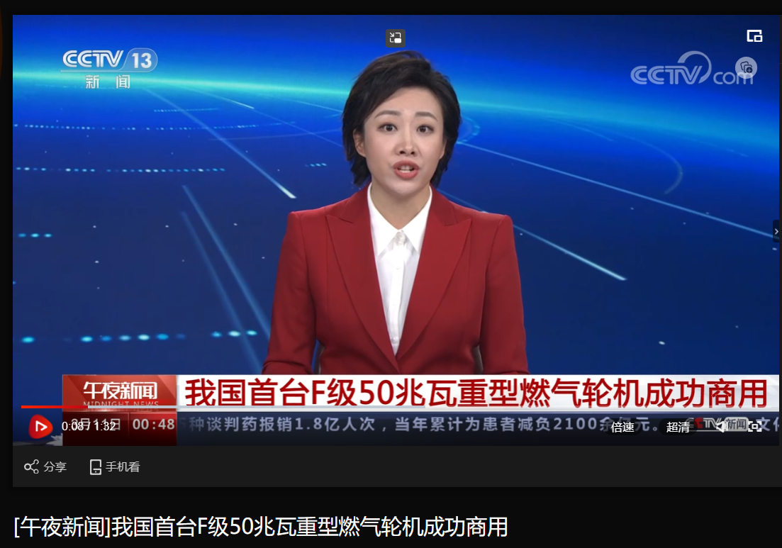 [央视午夜新闻]我国首台F级50兆瓦重型燃气轮机成功商用