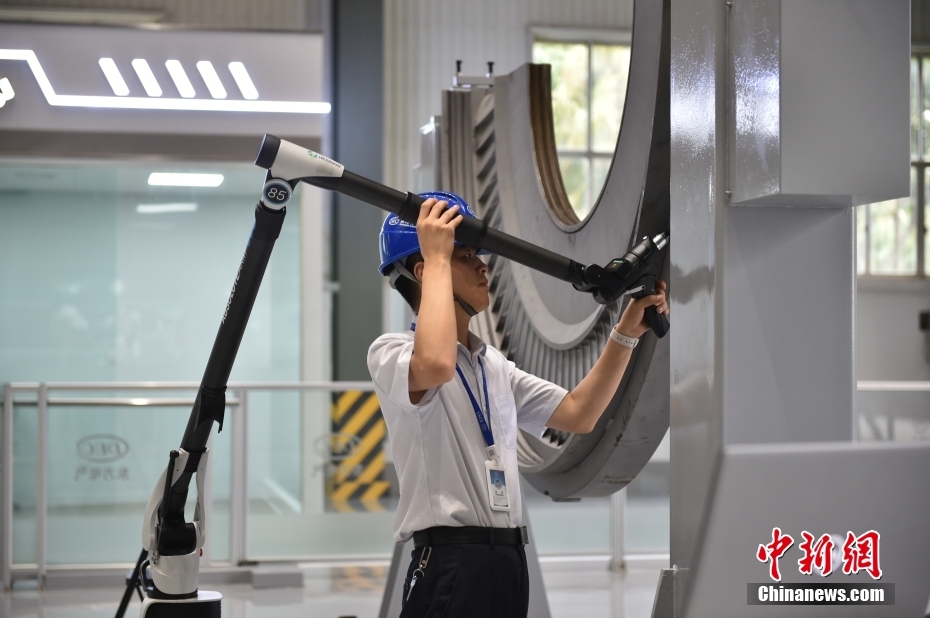 图为车间里的焊接机器人正在进行“铁臂绣花”。