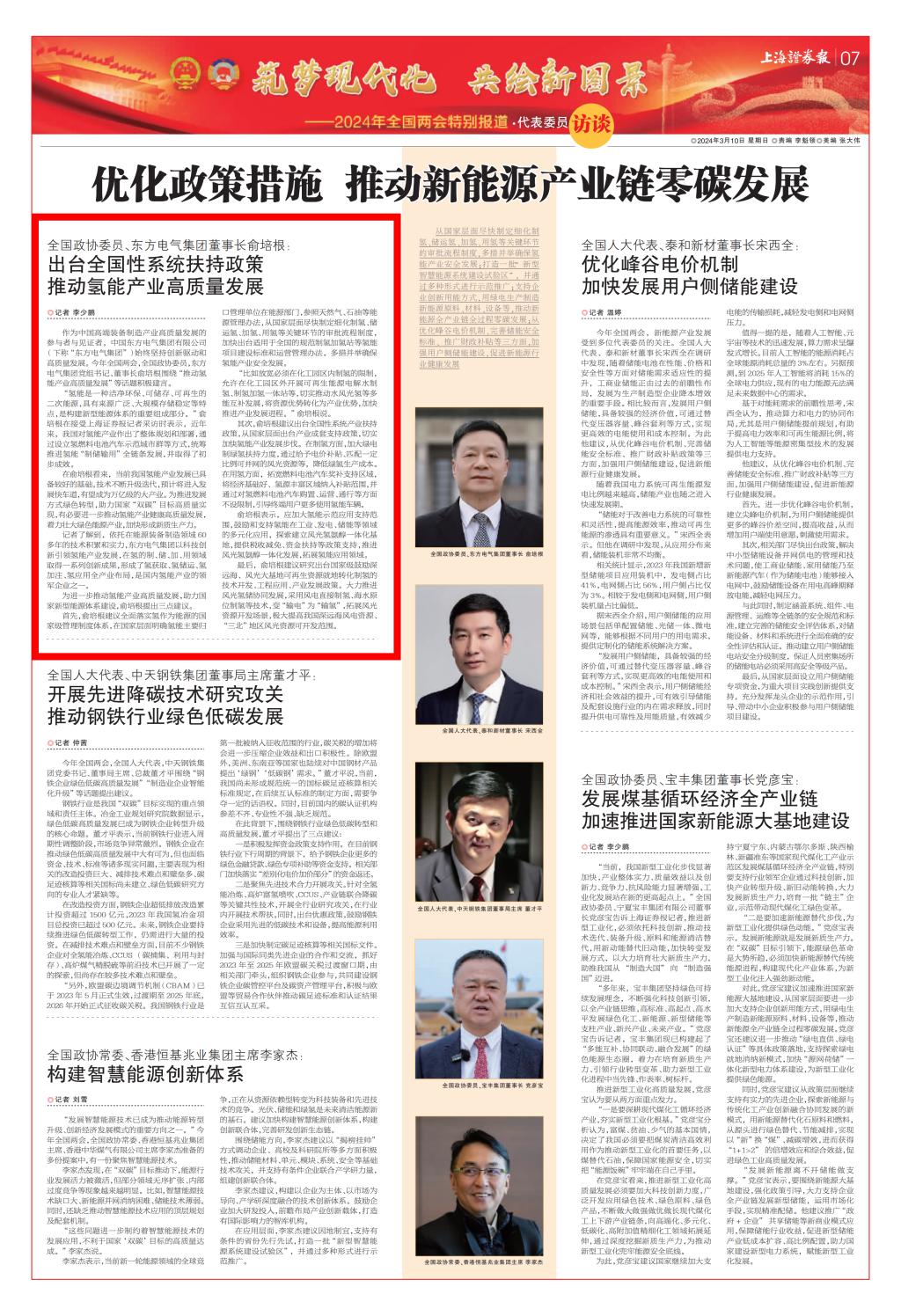 [上海证券报]全国政协委员、东方电气集团董事长俞培根:出台全国性系统扶持政策推动氢能产业高质量发展