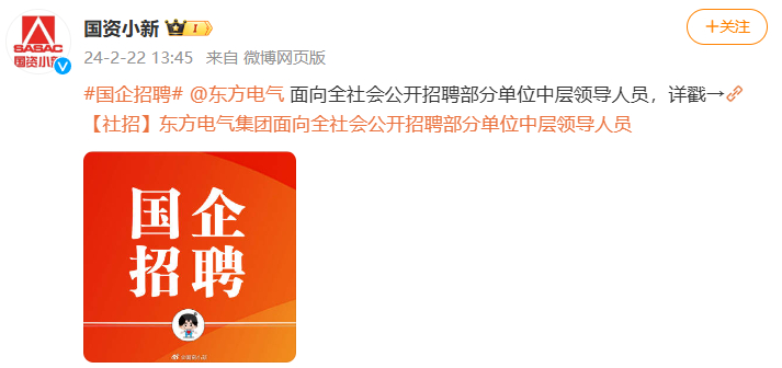 [国资小新]#国企招聘# @东方电气 面向全社会公开招聘部分单位中层领导人员,详戳→