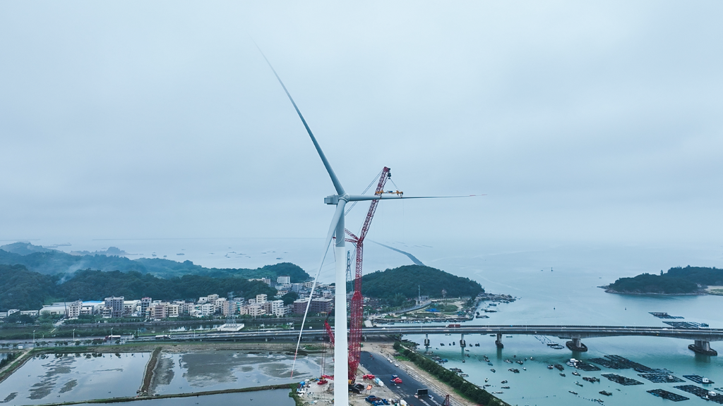 6月5日,18兆瓦半直驱大功率海上风电机组在广东省汕头市风电临海试验基地成功完成吊装。(东方电气集团供图)