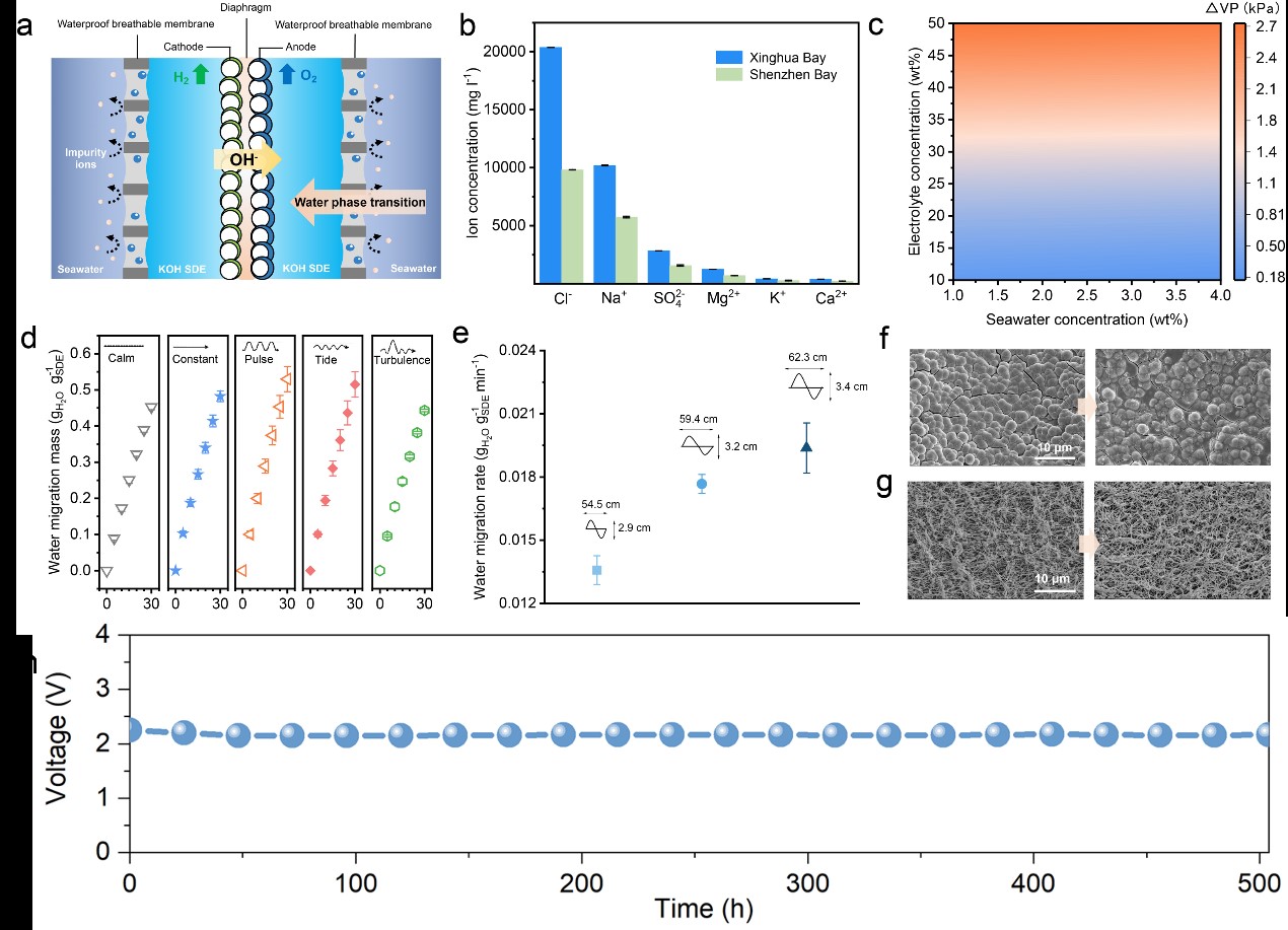 该团队基于2022年11月在《自然》发表的“海水直接电解制氢全新原理”,构建出真实大海不可控海洋波动环境下海水直接制氢全新路径与技术,并系统研究不同海水组分(广东省深圳湾、福建省兴化湾)浓度变化所导致界面蒸气压差差异,阐明浓度动态变化下相变迁移过程的自调控自适应机制。