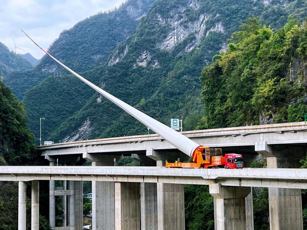 2021年11月,叶片扬举车执行重庆市石柱石家风电项目运输。(东方电气资料图片)